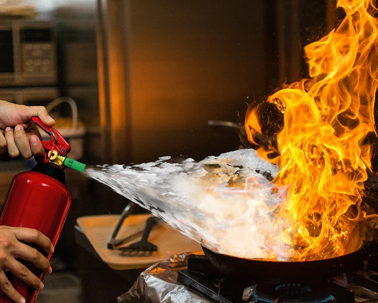 Lorsqu’un feu de graisse se déclare, l’eau ne peut pas être utilisée car elle aggrave le feu. L’extincteur à mousse Classe F est conçu pour agir efficacement en étouffant les flammes et en refroidissant la surface.